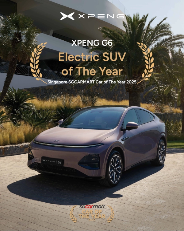 • XPENG G6 dianugerahi penghargaan “Electric SUV of the Year 2025” oleh SGCARMART, platform media otomotif dan pasar mobil terkemuka di Singapura.
